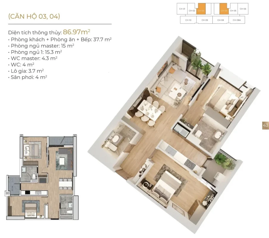 - Căn hộ: 2PN, 2PN+, 3PN, Duplex (diện tích từ 67,7 – 93m²)
